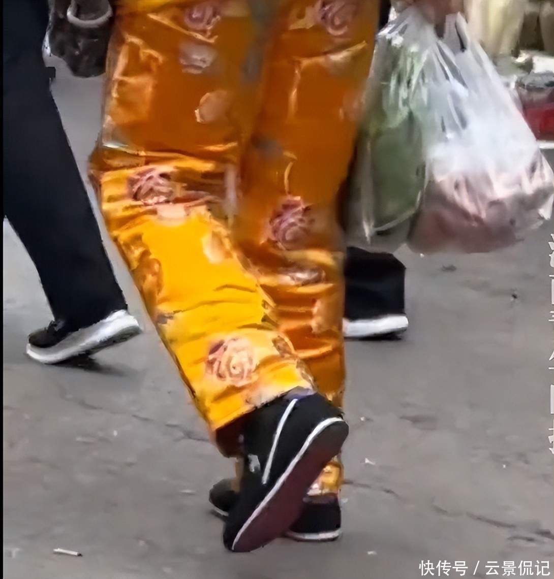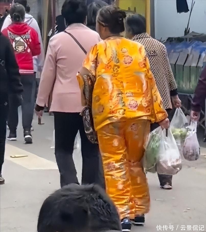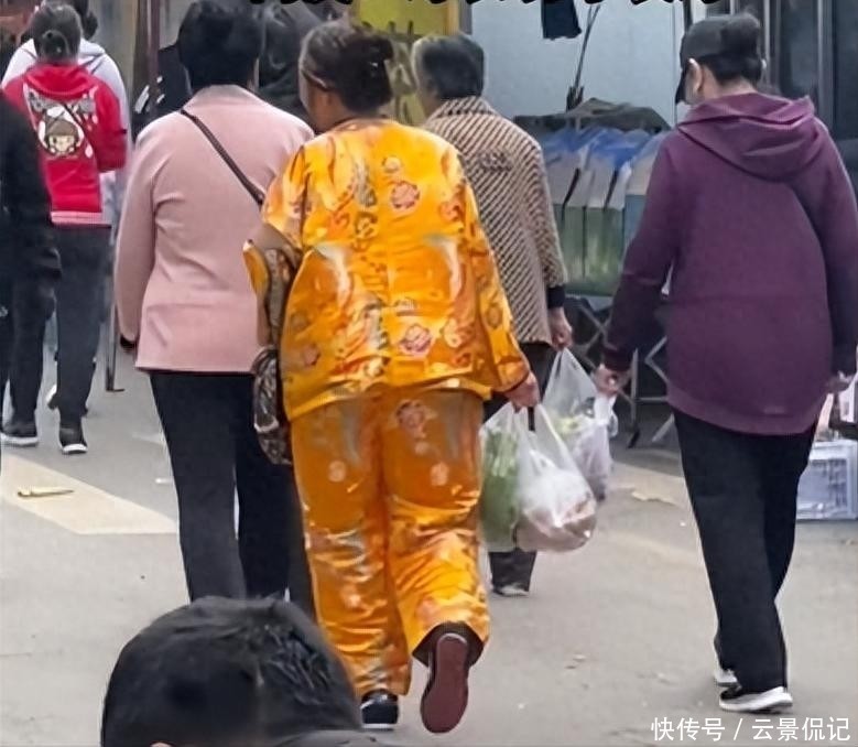画面中,她身着一件亮黄色缎面寿衣,步伐稳健地提着两大袋新鲜蔬菜,在菜市场的人流中穿行,那气场之强,瞬间吸引所有目光。